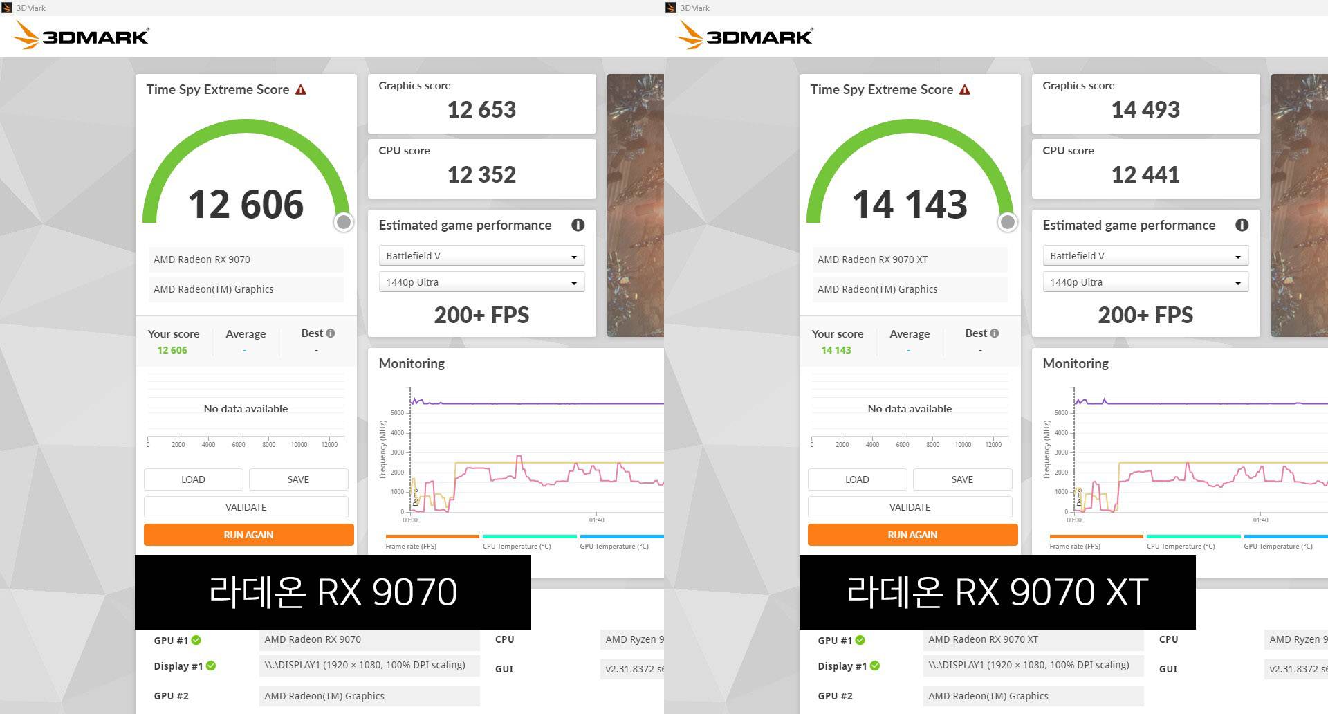 AMD 라데온 RX 9070(좌)과 RX 9070 XT(우)의 게임테크벤치 측정 결과. / 출처=IT동아 |
