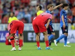 대표팀 선수들이 27일 일본에서 열린 동아시안컵 3차전 일본과의 경기 뒤 아쉬워하고 있다. 대한
