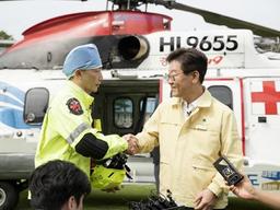 원장" 도청 간부 등 "의료계 기득권층 개혁 검찰개혁만큼 어려워" 지난해 8월 29일 오후 경기도청 잔디광장에서 열린 ‘응급의료전용헬기 종합시뮬레이션 훈련’에서 이재명 경기도지사가 이국종 아주대학교병원