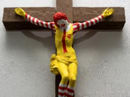 이스라엘에서 예수처럼 십자가에 못박힌 맥도날드 조각상이