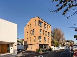 질감을 통해 스테이의 중심 공간이 되는 다이닝. 곡선 벽체로 감싸지며 라운지의 느낌을 낸다. 다이닝의 양 옆으로 배치된 침실들은 흰색 벽과 천장, 밝은 톤의 마루 바닥으로 조성되어 미니멀하면서도 안락한 분위기를 자아낸다. INTERVIEW_산온 : 리트릿