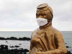 제주 제주시 도두동 무지개해안도로의 해녀 동상이 마스크를 쓰고 있는 모습./사진=뉴스1 제주도가 코로나19 의심 증상이 있는 상태에서 제주도를 관광한 뒤 확진 판정을 받은 미국 유학생