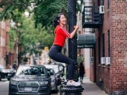 는 미국 뉴욕을 여행 중인 모습. 밀착 티셔츠에 레깅스를 입은