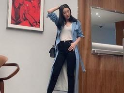 은 하얀 티셔츠에 청바지, 하늘빛의 롱자켓을 걸친 채 포즈를 취하고 있다. 작지만 남다른 비율의
