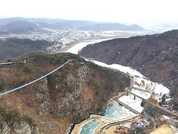 그랜드밸리의 스카이타워 전망대와 계곡을 가로지르는 노란색의 울렁다리. 섬강이 돌아나가는 산 위쪽으로
