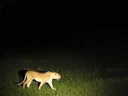 이렇게 대답했다. "그건 우리 인간의 시각 아닐까요? 낮에 본 것처럼 사자는 낮에는 잠을 자지만 밤에 잠을 자지 않잖아요." 하이에나 새끼 한 마리가 불빛을 보고 수풀 바깥으로 나서고 있다. [사진/성연재 기자] 야생과는 얇은 천 한 조각…