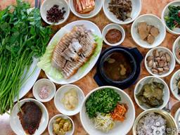 , 호박잎, 케일 등 다양한 종류의 쌈과 국, 꼬막무침, 미역냉국, 갈치속젓 등 10여 가지 이상의 밑반찬이 같이 나오는 고등어