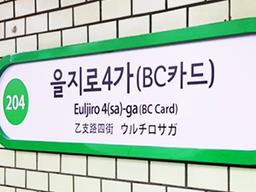 인 ‘을지로3가’에 ‘신한카드’라는 이름이 함께 붙어 있는 겁니다. 인근 을지로입구역(2호선)과 을지로4가역(2ㆍ5호선)도 안내방송에 각각 ‘IBK기업은행’과 ‘BC카드’가 본래