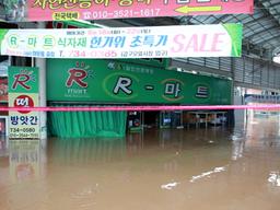 군은 이번에 내습한 제25호 태풍 콩레이의 영향으로 지난 5일부터 6일까지 평균 311.5㎜폭우가 내려 1명이 사망하고 주택 1300여채가 침수된 것으로 잠정 집계됐다. 사진은 강구시장 입구 침수현장.2018.10.07.(사진=