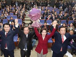 가 의원들의 축하를 받는 모습. /국회=이새롬 기자 비박계 김학용에 압승…'친박' 부활 신호탄 될까 나경원 자유한국당 의원이 11일 삼수 끝에 한국당 신임