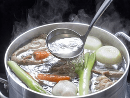 통구이로 먹고 남은, 살이 붙은 닭(1.5~2kg짜리)의 뼈를 토막 쳐 2ℓ들이 냄비에 담는다. 뼈가 잠길 만큼 물을 부어 아주 약한 불에서 2~6시간 데우듯 끓인다. 끓이는 내내
