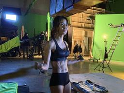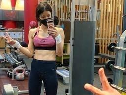 은 헬스클럽에서 운동 중 거울을 보고 포즈를 취하고 있다. 배우