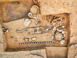 유적에서 발굴된 전형적인 무덤의 모습. 유골 화석은 남북 방향으로 누워 있고 주변에 부장품이 놓여 있다. 미국과 인도 연구팀은 이런 유골에서 DNA를 채취해