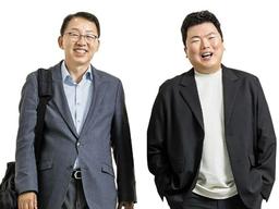 으로 취직한 65세 김준석(왼쪽)씨와 그를 뽑은 루와컨텐츠 대표 모상우씨가 영화 ‘