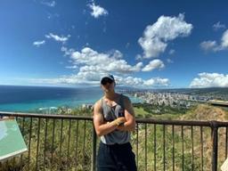 는 하와이 여행을 떠난 듯한 모습. 시원한 자연을 배경으로 압도적인 팔 근육을 자랑하고 있어 눈길을 끈다. 보디빌더 못지 않은 근육...