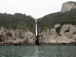 주민들이 ‘구랍’이라 부르는 해식동굴에서 본 해넘이 장면. 이 일대에 전북 부안 격포의 채석강 같은 층암절벽 지대가 길게 펼쳐져 있다. 지금껏 세 번 정도 겨눴던 것 같다. 그때마다 거센 바람과 악천후로 발길을 돌려세웠던 섬이 있다. 남녘의 절해고도